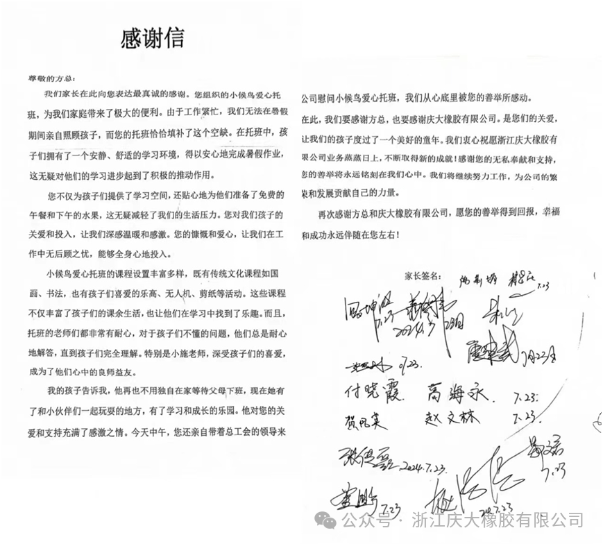 This is the first attempt of our Qingda company. Although all parties have insufficient conditions and experience, in order to allow employees to fully enjoy the benefits of the Yongkang Municipal Government, the company leaders and employees worked together to facilitate the smooth progress of this year's charity class. Although there were many shortcomings in our arrangements, the employees We all have a grateful heart. Not long after the class started, the parents jointly sent a sincere letter of thanks to the company. Here, Qingda would like to once again thank the party, government and units from all walks of life for their concern for our company and the care for foreign employees and their children. We also thank the parents for their understanding and cooperation.